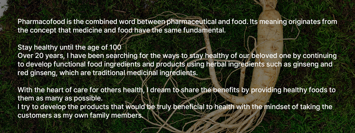 Over 20 years, I have been searching for the ways to stay healthy of our beloved one by continuing to develop functional food ingredients and products using herbal ingredients such as ginseng and red ginseng, which are traditional medicinal ingredients.